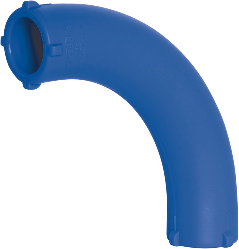 A curva possui um ângulo de 90 graus e um diâmetro externo de 90mm e 25mm, sendo projetada para ser utilizada em sistemas de tubulação de grande porte. A curva é na cor azul, indicando que é destinada para uso industrial.